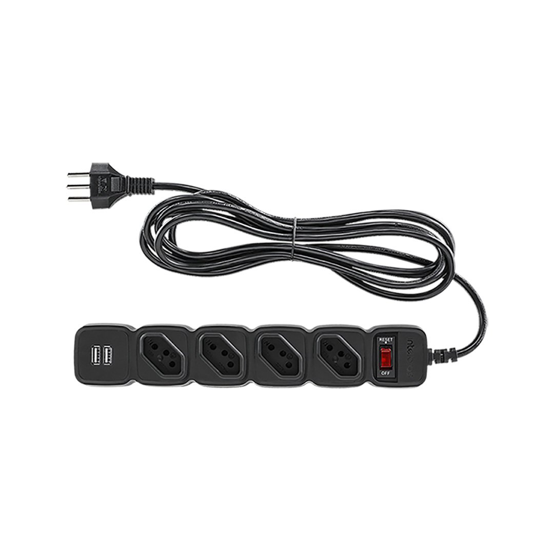O protetor eletrônico EPE 204 USB tem 4 tomadas e 2 portas USB para conectar e carregar seus dispositivos sem preocupações. Ele está disponível na cor preta ou branca, e com 1 ou 3 metros de cabo. Além disso, o EPE tem dupla proteção com chave inteligente contra curto-circuito e sobrecarga, e varistor contra surtos de tensão.